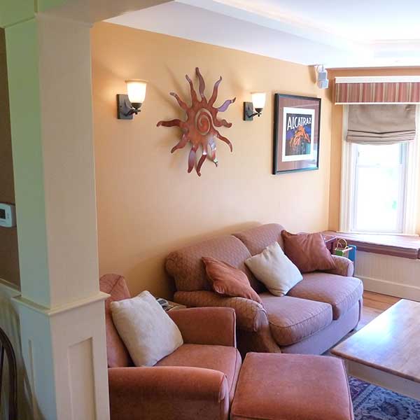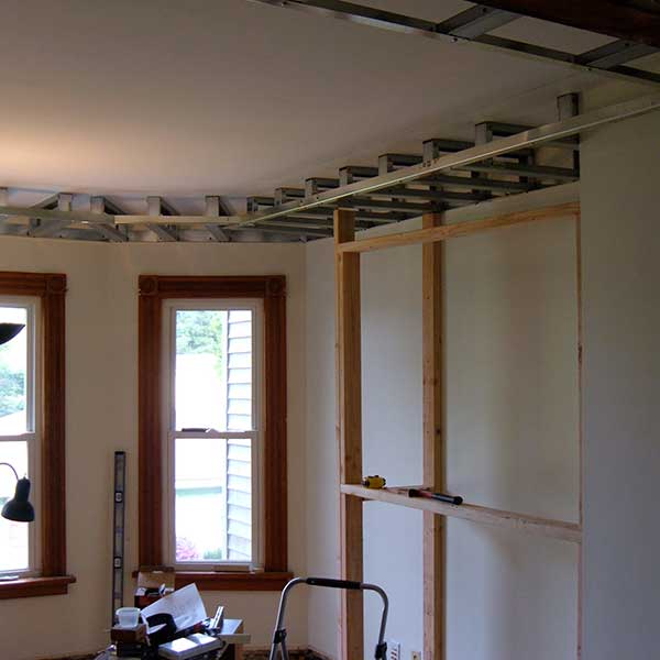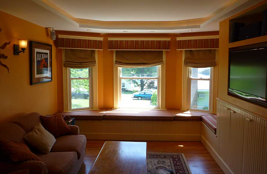 The window seat might be dynamic, but my favorite thing is the tray ceiling with lighting. I created a structure of ribs using steel frames that I finished with drywall. The space allowed me to install several small halogen spotlights, run wires for speakers. When complete I installed incandescent rope light which gives the room a nice diffuse light when watching a movie.