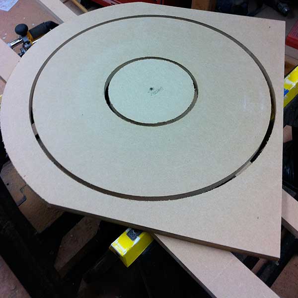 I looked online for large wheels that I could use for the project, but I couldn’t find anything that would work. I decide to build my own. Originally I was going to use the bandsaw to cut circles, but instead I mounted my router to a scrap board with a bolt on one end and made very exact circles. Once I had one set of wheels cut I could duplicate them with my flush trim bit.